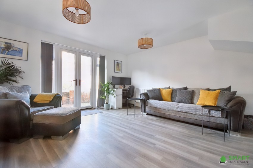 A light and spacious living room with wall mounted radiator and french double doors leading to the rear garden with floor to ceiling rear double glazed windows either side. Stairs leading to first